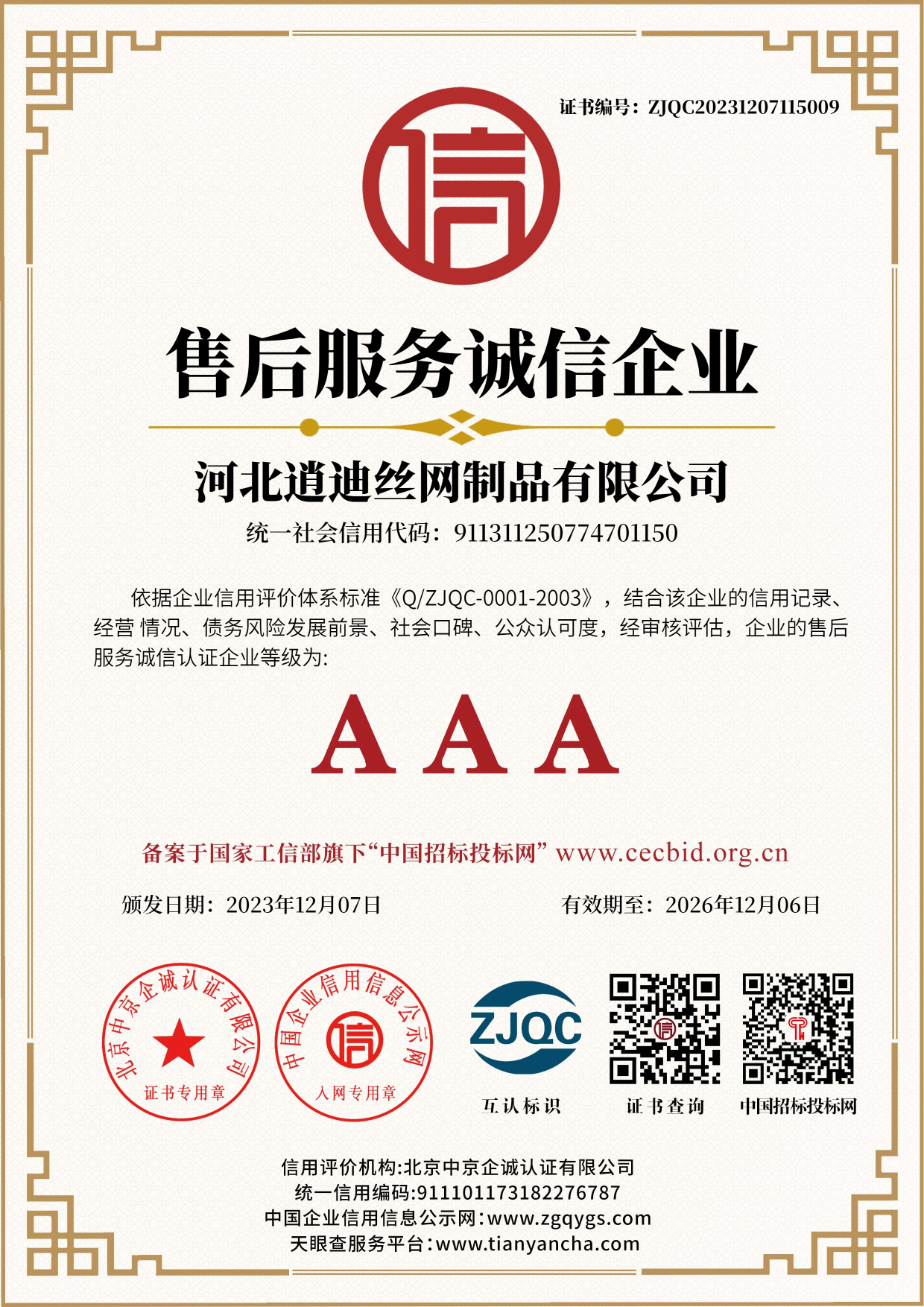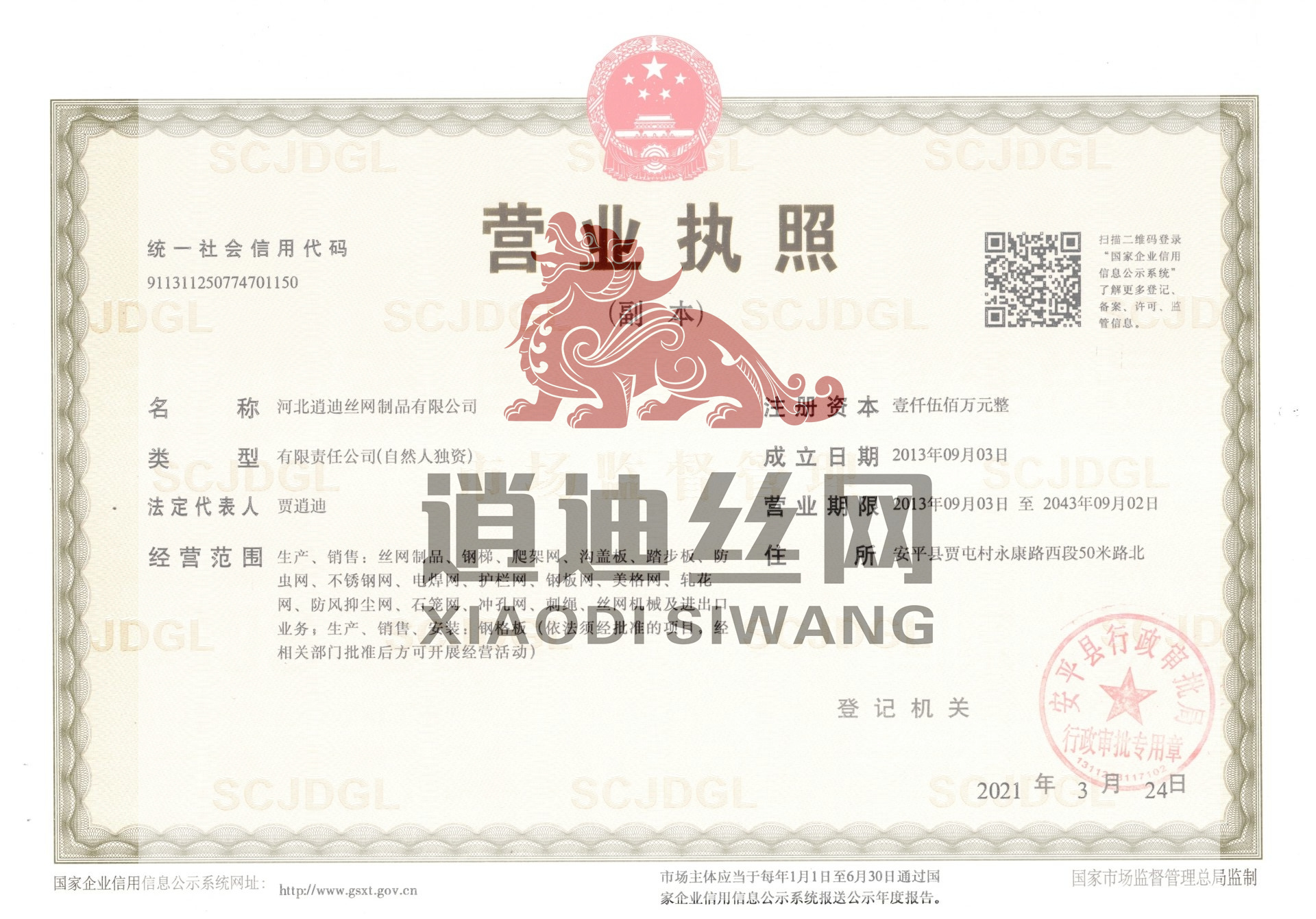 河北逍迪絲網制品有限公司誠信天下,誠信是我們公司一個原則問題不可撼動的,以心中有誠信的思想結交五湖四海的朋友,能達到雙贏是最好的,我們堅信朋友多了路好走,我們公司都是老朋友多,我們一直是這樣做的。河北逍迪絲網制品有限公司成立于2013年注冊資本壹仟伍佰萬整,主要生產沖孔網,鋼格板,金屬防蟲網,如實的實體廠家,是一家-研發(fā)-銷售-生產-安裝-售后一條龍公司,2019年通過了ISO 9001認證管理體系符合GB/T 19001-2016/ISO 9001:2015標準,同時通過了SGS認證,擁有商標版權2品牌,擁有一個著作版權,河北逍迪絲網制品有限公司位于中國有名的(絲網之鄉)安平縣,于天津,北京,雄安,石家莊相鄰,交通非常發(fā)達,出口可以選擇天津港口非常近每天都有接貨送貨往返車輛,空運可以選擇石家莊正定機場,附近也有鐵路運輸,當地還有兩個生態(tài)物流園區(qū)發(fā)往全國各地,我們沖孔網工廠生產設備有:普通沖壓機,高速沖壓機,自主研發(fā)小微孔沖壓機,龍門沖,磚塔沖孔,重型沖孔機,萬瓦級別激光切割機,3000W激光切割機,焊接設備,折彎機,校平機,剪板機,精密校平機,(對板面平整度要求苛刻的客戶群體0.5-0.2誤差)我們公司銷售市場沒有局限性國內國外都供應,擁有出口權...